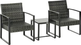 Nasz wysokiej jakości zestaw wypoczynkowy od Outsunny jest w ponadczasowo eleganckim czarnym kolorze. Dwa wygodne krzesła wykonane są z ręcznie tkanego polirattanu, a rama z malowanego proszkowo metalu. Elegancki stolik kawowy jest również wykonany z metalu i ma czarny blat. Zastosowane materiały są odporne na rdzę i warunki atmosferyczne. Wyciszone, wodoodporne poduszki na siedziska zapewniają dodatkową dawkę komfortu.