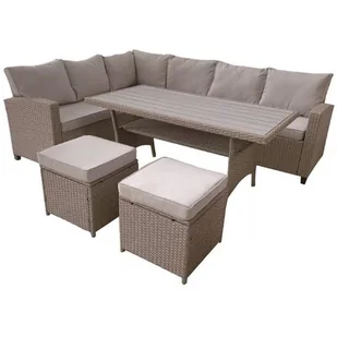Zestaw mebli ogrodowych marki Patio w kolekcji Nina. Wykonany z technorattanu. Idealnie dopasowany do Twoich potrzeb, składający się z dwóch sof z podłokietnikami, stołu z blatem z drewna syntetycznego oraz dwóch wygodnych taboretów, stworzy przestrzeń idealną do relaksu i spotkań w gronie najbliższych. Technorattan, z którego wykonane są meble, to materiał charakteryzujący się wyjątkową odpornością na warunki atmosferyczne, co gwarantuje ich długą żywotność i zachowanie estetycznego wyglądu na lata. Stalowe stelaże zapewniają stabilność i bezpieczeństwo użytkowania, a dołączone poduszki z poliestru dodają komfortu podczas wypoczynku.