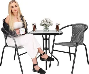 Meble na balkon: stolik kawowy z kwadratowym blatem z szkła hartowanego, 2 krzesła metalowe do ogrodu czarno-szary
