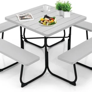 Nasz zestaw kwadratowego stołu piknikowego z 4 wbudowanymi ławkami może pomieścić parasol dzięki otworowi o średnicy 4,8 cm. Dzięki temu można wygodnie jeść i rozmawiać. Ponadto szerokie ławki zapewniają wystarczającą ilość miejsca dla 4 do 8 osób. Nie martw się o stabilność. Solidna metalowa rama zapewnia temu zestawowi dużą nośność (135 kg dla stołu i 225 kg dla każdej ławki). Ponadto wytrzymały materiał HDPE jest odporny na czynniki zewnętrzne, a jednocześnie ułatwia konserwację.