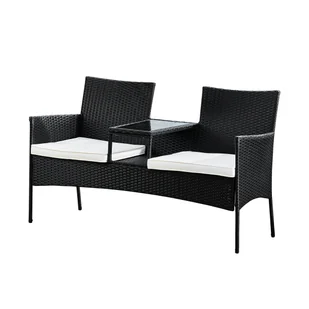 Teamson Home Meble Ogrodowe na Zewnątrz, Wiklinowa Ławka z Rattanu z 2 Poduszkami i Wbudowanym Szklanym Stołem i Półką, CzarnaOutdoor Wicker Loveseat firmy Teamson Home posiada dwa wyściełane krzesła z wbudowanym stolikiem kawowym. Ciemna wiklina rattanowa sprawia, że ten zestaw jest lekki, trwały do użytku na zewnątrz. "Przydymiony" szklany stolik pozwala dwóm gościom postawić swoje napoje, a pod spodem znajduje się półka, na której można umieścić książkę lub magazyn. Dwa fotele posiadają zdejmowane i nadające się do prania poduszki w kolorze kremowym dla dodatkowego komfortu. Ten pięknie wykonany dwuosobowy Loveseat jest idealny do relaksu i cieszenia się towarzystwem przyjaciela lub ukochanej osoby.