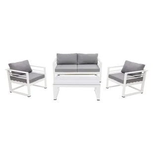 Rama z malowanego proszkowo aluminium, w skład której wchodzą: sofa 2-osobowa, 2 fotele, stolik kawowy; wodoodporna poduszka siedziska o grubości 10 cm poduszka oparcia o grubości 10 cm; blat z hartowanego szkła imitującego ceramikę o grubości 6 mm. Sofa 2-osobowa: 151,5*76*65 cm; 2 sofy pojedyncze: 72*76*65 cm; stolik kawowy: