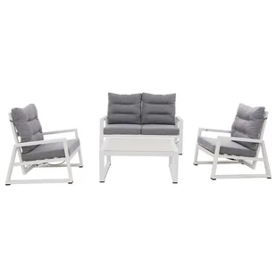 Odśwież swoją przestrzeń na świeżym powietrzu dzięki zestawowi wypoczynkowemu Mikonos, eleganckiemu, 4-osobowemu zestawowi o minimalistycznym, nowoczesnym wzornictwie. Stelaż wykonany jest z lekkiego, nierdzewnego, malowanego proszkowo aluminium w kolorze białym, a wyściełane poduszki siedziska i oparcia, obite szarą tkaniną poliestrową, są wodoodporne i odporne na promieniowanie UV. Zestaw uzupełnia prostokątny stolik kawowy z blatem z 5-milimetrowego szkła hartowanego z efektem białego kamienia, łatwym w czyszczeniu. Idealny do ogrodów, tarasów i stref relaksu w hotelach i ośrodkach wypoczynkowych, zestaw wypoczynkowy Mikonos łączy w sobie komfort, styl i łatwość konserwacji w jednym, wysokiej jakości produkcie. Możliwe są częściowe i niestandardowe kompozycje.