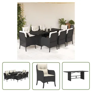 9-częściowy zestaw ogrodowy z poduszkami z czarnego polirattanuTen ogrodowy zestaw jadalniany jest idealnym wyborem do spożywania posiłków na świeżym powietrzu lub po prostu relaksu w ogrodzie, na podwórku lub na patio. Wytrzymały materiał: rattan PE, znany również jako polirattan, to wytrzymały, łatwy w pielęgnacji materiał syntetyczny o wyglądzie naturalnego rattanu. Charakteryzuje się niską wagą i jest łatwy w czyszczeniu. Ze względu na swoją trwałość i odporność na warunki atmosferyczne jest często wykorzystywany do produkcji mebli ogrodowych.