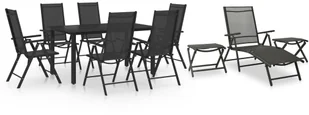 Malowane proszkowo, aluminiowe ramy sprawiają, że zestaw mebli jest bardzo wytrzymały i trwały. Krzesła ogrodowe mają miękkie w dotyku siedziska oraz oparcia wykonane z tkaniny textilene, które można ustawiać w 7 pozycjach, dzięki czemu zawsze możesz znaleźć najwygodniejsze ustawienie. Podnóżki zapewniają jeszcze większy komfort. Mogą one również posłużyć jako stoliki kawowe do postawienia napojów i przekąsek w zasięgu ręki. Stół jadalniany ma szklany blat, który można łatwo wyczyścić przy użyciu wilgotnej ściereczki.