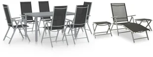 Malowane proszkowo, aluminiowe ramy sprawiają, że zestaw mebli jest bardzo wytrzymały i trwały. Krzesła ogrodowe mają miękkie w dotyku siedziska oraz oparcia wykonane z tkaniny textilene, które można ustawiać w 7 pozycjach, dzięki czemu zawsze możesz znaleźć najwygodniejsze ustawienie. Podnóżki zapewniają jeszcze większy komfort. Mogą one również posłużyć jako stoliki kawowe do postawienia napojów i przekąsek w zasięgu ręki. Stół jadalniany ma szklany blat, który można łatwo wyczyścić przy użyciu wilgotnej ściereczki.