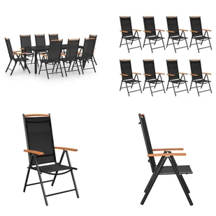 9-częściowy ogrodowy zestaw jadalniany aluminiowo-czarnyTen praktyczny, a zarazem stylowy zestaw ogrodowy jest idealny do relaksu lub spożywania posiłków w ogrodzie lub na patio. Malowana proszkowo aluminiowa rama sprawia, że zestaw mebli jest bardzo solidny i trwały. Krzesła ogrodowe są wyposażone w miękkie siedziska i oparcia, które można regulować w 7 pozycjach, dzięki czemu zawsze można cieszyć się najwygodniejszą pozycją siedzącą. Podłokietniki i górna listwa nadają krzesłom stylowy wygląd. Krzesła z wysokim oparciem można złożyć, aby zaoszczędzić miejsce, gdy nie są używane.