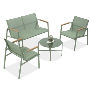 Szerokość siedziska 112cm, wysokość siedziska 38cm oraz głębokość siedziska 45cm sprawiają, że relaks staje się sztuką. Drewno polywood na podłokietnikach nadaje zestawowi unikalnego charakteru. MANGO CAFFE Green to nie tylko zestaw mebli ogrodowych - to prawdziwa ceremonia relaksu na świeżym powietrzu. Odkryj świat wyjątkowego designu, połączonego z funkcjonalnością i pozwól swojemu ogrodowi stać się przestrzenią niezapomnianych chwil w otoczeniu elegancji i spokoju. CechyKomplet składa się z wygodnej, dwuosobowej sofy, dwóch foteli oraz stolika kawowegoKonstrukcja mebla wykonana została ze stali galwanizowanejMebel pokryty jest specjalną tkaniną textilene, odporną na warunki atmosferyczneDekoracyjne podłokietniki swój estetyczny wygląd zawdzięczają wykończeniu z drewna polywoodStół pokryty jest 5mm szkłem hartowanym, dzięki któremu zachowa swoje właściwości na lata WymiarySofa: