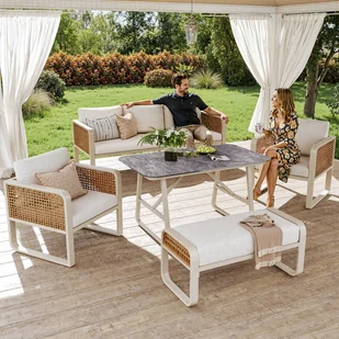Ten zestaw mebli ogrodowych składa się z 3-osobowej sofy, stołu i dwóch foteli. Charakteryzuje się nowoczesną i efektowną estetyką. Twój komfort jest naszym priorytetem, dzięki ergonomicznym, wysokim oparciom i głębokim siedziskom, które sprzyjają prawidłowej postawie i relaksowi.