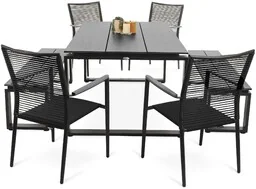 Rozbudowany komplet mebli ogrodowych Zerba szara, marki di volio, to idealna propozycja dla osób, które chcą stworzyć w swoim ogrodzie lub na tarasie funkcjonalną i komfortową przestrzeń do spotkań przy grillu, organizacji przyjęć, spożywania posiłków na świeżym powietrzu, a także do wypoczynku. W skład zestawu wchodzi duży stół jadalniany, dwie przestronne ławki ogrodowe i cztery wygodne krzesła z podłokietnikami, które zapewniają miejsce do siedzenia dla całej rodziny i gości. Meble cechuje solidne wykonanie i trwałość zastosowanych materiałów, co gwarantuje ich długą żywotność i zachowanie estetycznego wyglądu przez wiele lat użytkowania. Nowoczesny design oparty na prostocie form i uniwersalnej kolorystyce, ograniczonej do eleganckiej, matowej czerni i szarości, sprawia, że komplet mebli Zerba sprawdzi się zarówno w tradycyjnej, jak i modernistycznej aranżacji. Stół z trwałym blatem polywood Duży stół jadalniany z przestronnym blatem to praktyczny i stylowy mebel ogrodowy, który zapewnia optymalną ilość miejsca do wygodnego spożywania posiłków.