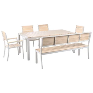 Nowoczesny stół z krzesłami i ławką do ogrodu. Ten zestaw składający się ze stołu, ławki i czterech krzeseł z możliwością sztaplowania zachwyca swoim nowoczesnym, ponadczasowym wyglądem. Meble wykonane zostały z wysokiej jakości sztucznego drewna w jasnym kolorze, a ich rama zrobiona jest z proszkowo malowanego aluminium w białym odcieniu. Są odporne na rdzę czy promieniowanie UV, a ponadto stabilne i niezwykle wytrzymałe. Szczegóły: Typ produktu: