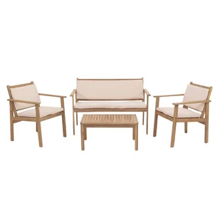 - Zestaw ogrodowy z olejowanego drewna akacjowego, składający się ze stołu, ławki i dwóch krzeseł, zapewnia najwyższy komfort. Poduszki siedziskowe i oparciowe z wodoodpornymi, zdejmowanymi pokrowcami zapewniają wygodę, a tapicerka jest mocowana za pomocą wiązadeł.