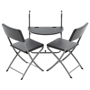Krzesła łatwo się składają, a stół składa się łatwo i prosto. Czy na balkonie, czy na tarasie: dzięki różnym możliwościom regulacji zestaw można zastosować na dowolnej balustradzie lub parapecie. Czy jako stolik kawowy, czy jako miejsce do przechowywania, na śniadanie lub po pracy. Meble balkonowe mogą być wykorzystywane we wszystkich funkcjach. Polirattan jest bardzo łatwy w utrzymaniu i czyszczeniu. Meble balkonowe można pozostawić na zewnątrz bez względu na pogodę. Twardy plastikowy blat ma regulowaną wysokość w 3 pozycjach i zależy od wysokości poręczy. Stolik balkonowy jest również wyposażony w dwie wnęki, które służą jako uchwyty na napoje. Meble balkonowe są solidne, stabilne i łatwe w pielęgnacji. Jeśli mebel nie jest potrzebny, można go od razu złożyć i schować, aby zaoszczędzić miejsce.