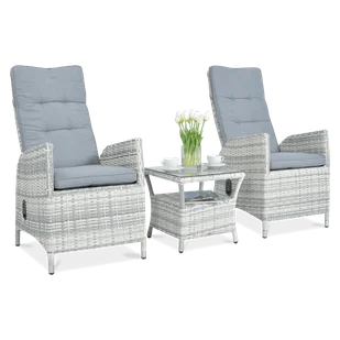 Zestaw wypoczynkowy MALTA DUO White GreyFocus Garden Dwuosobowy zestaw Malta Duo White Grey to niezwykle wygodny i funkcjonalny komplet wypoczynkowy dla 2 osób, składający się z 3 elementów. Fotele wyposażone są w wysokie oparcia, które dodatkowo posiadają płynną, hydrauliczną regulację kąta nachylenia zapewniając maksymalny relaks i odpoczynek. Uzupełnieniem całości jest zgrabny stolik kawowy ze szklanym blatem oraz dolną półką - na przykład na książki, gazety lub cokolwiek innego, co warto mieć pod ręką podczas ogrodowego relaksu. Wszystkie meble bazują na trwałej, stabilnej konstrukcji ze stali, a całość wykończono plecionką technorattanową w kolorze białoszarym. Zarówno fotele, jak i stolik z zestawu wypoczynkowego Malta Duo utrzymane są w jednorodnej, modnej stylistyce.
