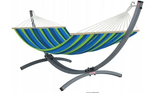 youtube. com/watch?v=r_L-l5gzkwo GŁÓWNE CECHY - wygodny, duży hamak 2-osobowy - piękna, nowoczesna, letnia kolorystyka - oddychający materiał 65% bawełna 35% poliester - grube, plecione sznury Dane techniczne stelaża oraz hamaka: STELAŻ - DŁUGOŚĆ ~ 360 cm - SZEROKOŚĆ ~115 cm - WYSOKOŚĆ ~115 cm - WYTRZYMAŁOŚĆ - 300 kg - OCYNKOWANY - MALOWANY PROSZKOWO - Z BOKU OBRAZOWO ILE MIEJSCA POTRZEBUJESZ HAMAK - DŁUGOŚĆ po rozciągnięciu - 220 - SZEROKOŚĆ po rozciągnięciu - 160 cm MOCOWANIE Hamak zaczepiany jest na bardzo masywne haki w S co gwarantuje bezpieczeństwo podczas huśtania, dodatkowo w zestawie linki przedłużające o nośności 400 kg - należy naciągać hamak linkami do uzyskania odpowiedniej długości oraz wygody legowiska.