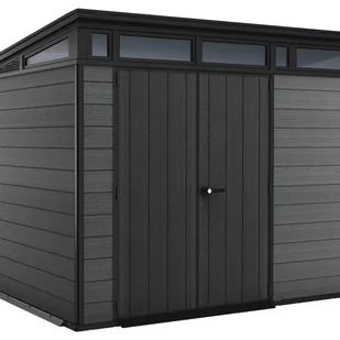 Choć domek nie posiada okien, jego grafitowy kolor nadaje nowoczesny i elegancki wygląd. W komplecie znajduje się podłoga, co ułatwia montaż, a zalecany fundament o wymiarach 220x282 cm zapewnia stabilność konstrukcji. Produkt objęty jest 10-letnią gwarancją producenta, co potwierdza jego wysoką jakość i trwałość. Doskonały wybór jako domek ogrodowy i narzędziowy, łączący funkcjonalność z nowoczesnym designem. . Odporne na warunki atmosferyczne.