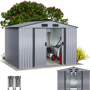 Narzędzia ogrodowe są bezpiecznie przechowywane w metalowej szopie narzędziowej GARDEBRUK® XXL z fundamentem. Całkowite wymiary z dachem wynoszą (dł. x szer. x wys.) 260 x 205 x 180 cm. Szopa narzędziowa posiada również dwuczęściowe drzwi przesuwne ułatwiające dostęp oraz 4 otwory wentylacyjne u góry, 2 z przodu i 2 z tyłu. Do uchwytów drzwi można przymocować kłódkę (brak w zestawie). Odporna na warunki atmosferyczne szopa narzędziowa jest dostarczana z listwą przypodłogową.