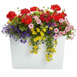 Duża skrzynka balkonowa w kolorze białym z wkładem i systemem nawadniającym, o nowoczesnym wyglądzie, przeznaczona do aranżacji roślin na balkonie i tarasie.