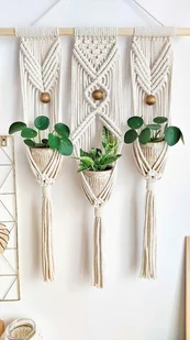 Kwietnik makrama wiszący, ze sznurka na ścianę, potrójny. Kwietnik, powieszony jest na drewnianym drążku (w zestawie). Kwietnik, został wykonany ze sznurka bawełnianego 5mm kolor naturalny. W kwietnik ...