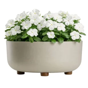 Plastikowa beżowa doniczka w kształcie misy na nóżkach o okrągłej, niskiej formie, która delikatnie eksponuje rośliny i uzupełnia ciepłe aranżacje wnętrz.