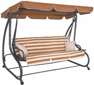 Leżanka ma modny w tym sezonie brązowo-biały kolor oraz beżowe, miękkie poduszki. Jej stabilna konstrukcja zapewnia bezpieczeństwo użytkowania, a regulowany daszek doskonale chroni przed słońcem. Stelaż huśtawki powstał z grubych, wytrzymałych rurek , natomiast siedzisko wzmocniono siatką z drutu. Na zakończeniu nóżek umieszczono elementy antypoślizgowe, które dodatkowo stabilizują mebel. Przed samoistnym złożeniem huśtawki chroni specjalna blokada zabezpieczająca.