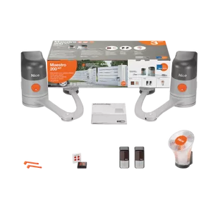 NICE HOME MAESTRO200- zestaw napędów do automatyzacji bram dwuskrzydłowych z ramieniem łamanym o szerokości jednego skrzydła do 2,2 m i ciężarze do 150 kg. Światło bramy do 4,4 metra – 2 skrzydła o długości po 2,2m każde. Zestaw przeznaczony do samodzielnego montażu.
