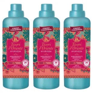Płyn do płukania tkanin Ayurveda (38 prań) Zestaw 3 x 760 mlTen ajurwedyjski zapach z delikatnymi nutami cytrusowymi, wzbogacony o wykwintne mikrokapsułki, nadaje praniu czarujący zapach zapewnia uczucie dobrego samopoczucia i harmonii. Jego kremowa formuła bez barwników rozciąga tkaniny, ułatwiając ich prasowanie.