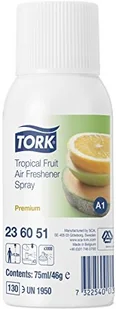 Odświeżacz powietrza w sprayu Tork 236051, zapach owocowy, pojemność 75 ml = 3000 doz. Wkład wystarcza na 3000 dawek, dostarczając przy tym długotrwałego, świeżego zapachu wystarczającego na okres od 30 do 90 dni. Zawiera trzykrotnie więcej olejku perfumowanego niż inne dezodoranty. Odświeżacz o zapachu owoców tropikalnych nie jest duszący i eliminuje zapachy 24 godziny na dobę. Eliminując nieprzyjemny zapach w pomieszczeniu daje poczucie czystości w łazience. Zapewnia świeżość 24 godziny na dobę.