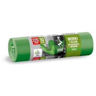 Anna Zaradna Worki do segregacji szkła 120 l 10 sztuk Worki na śmieci do pakowania i segregowania odpadów szklanych. Do zielonego worka na odpady możemy wrzucić: opróżnione szklane butelki i słoiki po napojach i żywności, szklane opakowania po kosmetykach (jeżeli nie są wykonane z trwale połączonych kilku surowców). Worki mają mocny zgrzew typu gwiazda, co oznacza że nie przeciekają i świetnie pasują do okrągłych pojemników na odpady. Idealnie sprawdzają się w domu, biurach, miejscach publicznych.