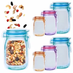 PRAKTYCZNE - Zestaw 6 sztuk plastikowych worków w kształcie słoików z praktycznym zamykaniem. Worki w zestawie występują w trzech rozmiarach: 2x duży (24,5 x 17 cm o pojemności 700 ml), 2x średni (19,5 x 13,5 cm i pojemności 400 ml) oraz 2x mały (15,5 x 10,5 cm i pojemności 150 ml). SZCZELNE - Worki zamykane są za pomocą zacisku, który zapewni szczelne zamknięcie zawartości. UNIWERSALNE - Worki służą do przechowywania żywności oraz sypkich produktów.