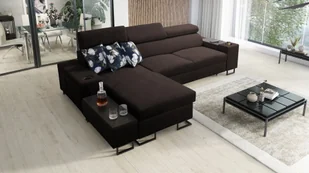 Narożnik oferuje także praktyczne półki, na których można trzymać książki czy laptopa, a jedna z półek kryje w sobie ukryty barek, nadając meblowi oryginalny charakter. Wbudowane uchwyty na kubki oraz port USB to kolejne elementy, które zwiększają komfort użytkowania, umożliwiając ładowanie urządzeń mobilnych i relaks bez zmartwień o baterię. Specyfikacja: Sprężyny faliste Zawiera trzy poduszki dekoracyjne zapinane na zamek Pianka HR35 Drewniana rama Trzy regulowane zagłówki Pojemnik na pościel Dwa uchwyty na kubki USB Wymiary: Szerokość: 291 cm Głębokość: