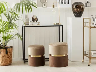 Zestaw podnóżków ze schowkami Udekoruj swój salon czy sypialnie tym zestawem retro puf. Ich tapicerka, wykonana z weluru, jest łatwa w utrzymaniu, będąc jednocześnie bardzo wytrzymałą. Pufy przyciągają uwagę za pomocą unikatowego połączenia różnych odcieni brązowego koloru i złotego paska, oplatającego środek konstrukcji. Pojemniki do przechowywania ukryte są za wiekami i pozwalają na ukrycie niepotrzebnych poduszek czy zbędnych przedmiotów z salonu. Szczegóły: Kolor: Brązowy, Złoty.