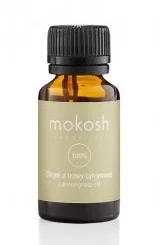 Olejek eteryczny z trawy cytrynowej Mokosh znany jest ze zdolności do odstraszania owadów ze względu na zawartość cytralu i geraniolu. Wykazuje silne działanie przeciwzapalne, przeciwgrzybicze i ściągające. Dedykowany jest zatem pielęgnacji cer tłustych oraz trądzikowych. Minimalizuje nadmiar sebum, zwęża pory i niweluje stany zapalne. Wspomaga leczenie nadciśnienia i walkę z migreną. Łagodzi skurcze mięśniowe, rozluźnia je i uelastycznia.