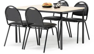 Niewielki zestaw mebli do stołówki złożony ze stołu i 4 krzeseł. Stół posiada trwały i łatwy w pielęgnacji blat. Krzesła z możliwością sztaplowania. Delikatnie wyściełane siedziska i oparcia z uchwytami. Praktyczny zestaw do stołówek, sal konferencyjnych, pomieszczeń socjalnych itp.