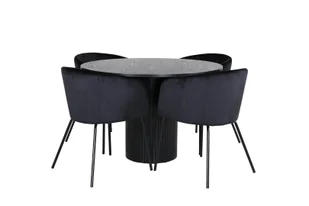 Zestaw stół do jadalni BiancaROBL czarny i 4 krzesła Berit welurowe czarne to zestaw stołów do jadalni w kolorze, który wniesie do Twojego domu zarówno styl, jak i funkcjonalność. Zestaw BiancaROBL stół do jadalni czarny i 4 krzesła Berit welurowe czarne. Stół Bianca 60-15596-848. Øcm 110. stół cm: L110 x D110 x H74. Stół: MDF, fornir dębowy, drewno topoli.