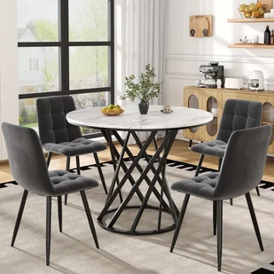 Zestaw jadalny (5 elementów): Ciesz się przyjemnymi posiłkami z naszym nowoczesnym zestawem jadalnym, składającym się z eleganckiego stołu i czterech wygodnych krzeseł.