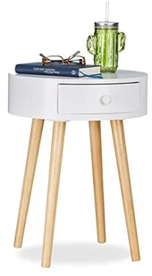 Ten jasny, biały stolik boczny przyciągnie wzrok do Twojego domu. Skandynawski design z nogami wykonanymi z naturalnego drewna sosnowego sprawia, że stolik boczny będzie ozdobą salonu i sypialni. Okrągły blat wysokiego stolika można wykorzystać jako stojak na gazety przed sofą lub przekształcić ten designerski mebel w osobisty stolik nocny. Możesz także przechowywać przedmioty, których nie chcesz, aby leżały w przestronnej szufladzie. Biały stolik boczny z szufladą w szczegółach - Wymiary całkowite wys.