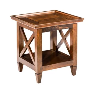 Prosty i elegancki stolik wykonany z drewna egzotycznego w kolorze brązowym. Boki stolika zdobią skrzyżowane listwy. Może pełnić rolę stolika kawowego w salonie, jak również stolika nocnego w sypialni. Mebel w ciemnych odcieniach dobrze sprawdzi się w pomieszczeniach o klasycznym wystroju. Wymiary: szer. 45cm, gł. 45cm, wys. 50cm. Materiał: drewno egzotyczne- kauczukowiec.