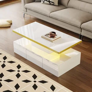 Dodaj odrobinę elegancji do swojego salonu dzięki temu błyszczącemu stolikowi kawowemu. Gładka powierzchnia odbija światło, tworząc świetlisty i atrakcyjny efekt. Wyobraź sobie mebel, który delikatnie odbija światło, rozświetlając przestrzeń bez rezygnowania ze stylu i elegancji.