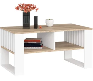 to harmonijne połączenie stylu i praktyczności, które wzbogaca każde wnętrze. Stolik kawowy z eleganckimi lamelami - doskonałe połączenie stylu i funkcjonalności: unikalne lamele po bokach nadają wyrafinowany charakter dwupoziomowa konstrukcja zapewnia dodatkową przestrzeń do przechowywania prostokątny kształt idealnie wpasowuje się w każde wnętrze doskonały do ozdabiania salonu oraz praktyczny na drobne przedmioty Wysokiej jakości materiały wykorzystane w produkcji stolika kawowego : Płyta wiórowa pokryta laminowaną powłoką - trwały i wytrzymały materiał meblowy, odporny na uszkodzenia mechaniczne, działanie wilgoci oraz łatwy w utrzymaniu czystości. Obrzeża ABS - tworzywo charakteryzujące się dużą wytrzymałością, odpornością na zarysowania oraz estetycznym wykończeniem krawędzi.