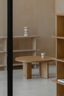 Okrągły stolik kawowy ze sklejki. Prosta konstrukcja składająca się z blatu opartego na czterech regularnych elementach. Mebel idealnie znajdzie dla siebie miejsce w salonie. Stolik na zdjęciu ma średn ...