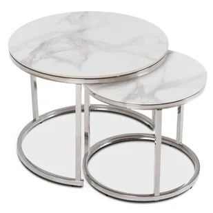 Zestaw stolików kawowych Amara to eleganckie i funkcjonalne połączenie dwóch okrągłych stolików z ceramicznymi blatami w dekorze białego marmuru oraz stabilną, srebrną metalową podstawą, które możesz ustawić razem, rozsunąć lub schować jeden pod drugi, tworząc efektowną i praktyczną aranżację salonu. Ich lekka forma i luksusowy wygląd doskonale podkreślą charakter nowoczesnych wnętrz. Wymiary: stolik większy ⌀60 × 45,5 cm, stolik mniejszy ⌀45,5 × 40,5 cm.