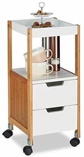 Białe półki naprawdę wyróżniają się dzięki naturalnemu bambusowi - przyciągają wzrok! Wózek z szufladami w szczegółach- Wymiary wys. x szer. x gł. : ok. 69 x 30 x 30 cm - Wymiary wewnętrzne szuflady na wys. x szer. x gł. : ok. 8,5 x 23,5 x 25,5 cm - Nośność szuflady: ok. 12 kg - Odległość między półką a tacą H: ok. 23,5 cm - Nośność półki i tacy: