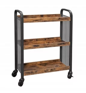 Trzy pojemne półki pozwolą Ci zaoszczędzić miejsce w kuchni, sypialni czy salonie. Możliwość użytkowania na kółkach lub bez zapewnia komfort dostosowania mebla do Twoich potrzeb. Może służyć jako wózek kuchenny, stolik do sypialni lub salonu obok kanapy. Wymiary: wys. 85cm ; szer. 66cm ; gł. 26cm Cztery kółka (2 z hamulcami) Wielofunkcyjny 3 praktyczne półki Kompaktowy - nie zajmuje dużo miejsca Styl rustykalny Możliwość użytkowania bez kół, jako półka Wysokiej jakości płyta wiórowa + stal Solidna, czarna rama oraz elegancka powierzchnia z drewnianym wzorem w stylu vintage to harmonijne połączenie różnych materiałów, które nadają temu stolikowi wyjątkowy wygląd.