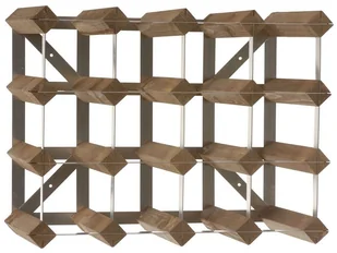 Drewniany regał na 16 do wina na stalowym stelażu z drewnianymi podpórkami.
