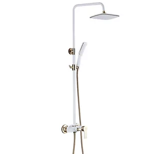 Zestaw prysznicowy INDES Nowoczesny i ekskluzywny wygląd Wysoka jakość produktu Eleganckie połączenie kolorystyczne Gwint 1/2 cala Kolor dominujący: biały / złoty Natrysk, deszczownica oraz kran Materiały: miedź, nikiel, chrom Montaż: do ściany Wąż stalowy - długość węża 150 cm