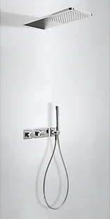 Tres Study Exclusive zestaw natryskowy z baterią termostatyczną Block System 20735202 Kolor: chrom Regulacja strumienia (dwudrożna) W zestawie z termostatycznym korpusem podtynkowym Natrysk ścienny ze stali nierdzewnej 210x550 mm Słuchawka antical Wąż Pokrętło Podtynkowa