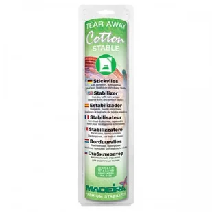 Stablizator wydzierany, flizelina do haftu przyklejana na ciepło Madeira Cotton Stable w kolorze białym 30cm x 5m - 9438 Typ stabilizatora: fizelina wydzieralna Wymiary: szerokość 30 cm, długość 5 m (0,3 m x 5 m) Materiał: bawełna Kolor: biały Gramatura: