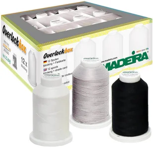 ZESTAW NICI OWERLOKOWYCH STANDARDOWYCH AEROLOCK I ELASTYCZNYCH AEROFLOCK - MADEIRA 9200 Madeira 9200 to bardzo uniwersalny zestaw nici do owerloka, covera i coverloka, który zawiera 12 szpulek w trzech kolorach - kremowym, szarym, czarnym i dwóch rodzajach - Madeira Aerolock (standardowe) i Maderia Aeroflock (elastyczne). Nić Madeira Aerolock jest standardową nicią owerlokową, doskonałą do szycia tkanin i materiałów mniej elastycznych. Natomiast nić Madeira Aeroflock to najwyższej jakości miękka, elastyczna nić owerlokowa, idealna do szycia rozciągliwych materiałów. Doskonała do szycia bielizny, odzieży sportowej, strojów kąpielowych, odzieży gimnastycznej itd. Wyjątkowa konstrukcja sprawia, że dokładniej opłata krawędź materiału (zdecydowanie bardziej niż nić standardowa Aerolock), doskonale współpracuje z nim w czasie rozciągania, a powstały szew jest miękki i wygląda perfekcyjnie nawet po wielokrotnym praniu.
