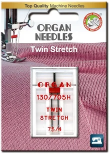 Igła podwójna półpłaska Organ 130/705H TWIN do stretchu do maszyn domowych, japońska technologia. Opakowanie zawiera 1 sztukę igły na blistrze o rozstawie 4mm oraz grubości 2x75. Zalecane do materiałów: stretchu, dzianiny i trykotu. Igły pasują do większości domowych maszyn do szycia.
